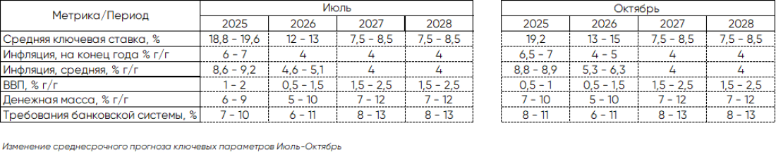 Помимо снижения ставки, Банк России пересмотрел свой среднесрочный прогноз, поскольку текущее заседание было опорным. Последний прогноз был опубликован в июле, и с тех пор макроэкономические показатели сигнализировали об ухудшении ситуации в экономике. Ниже представлены ключевые изменения в обновлённых прогнозах.