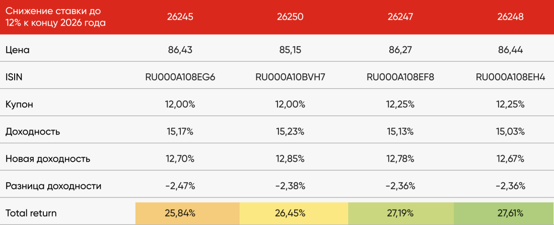 Ключевой интерес представляют бумаги высокого качества (рейтинги АА–ААА) со сроком погашения от 2 лет. Длинные ОФЗ также представляют интерес; в случае тактических просадок целесообразно рассмотреть увеличение позиции. Целевая доходность к погашению на горизонте 12–18 месяцев по длинным выпускам может составлять 12,0–13,0%, при этом общая доходность с учётом переоценки тела облигации может превысить 25%. В то же время оптимальным решением будет сохранять умеренную долю портфеля в фондах ликвидности и РЕПО, что позволит получать высокую текущую доходность и использовать возможности при рыночных просадках.