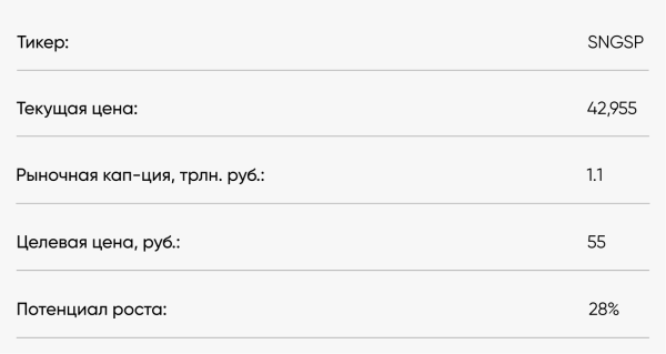 При этом картина по дивидендам может существенно измениться по итогам 2026 г., который начинается с очень низкого курса доллара США — около 79,5 руб./$1. По нашим прогнозам, на конец года курс может вырасти до 90 руб./$1, что транслируется в дивиденд по префам «Сургута» в районе 8 руб. на акцию и дивидендную доходность на уровне 18,6% на горизонте полутора лет (дивиденды за 2026 г. будут выплачиваться в июле 2027 г.). Соответственно, при более высоком курсе доллара на конец 2026 г. дивиденды по префам могут быть ещё выше.