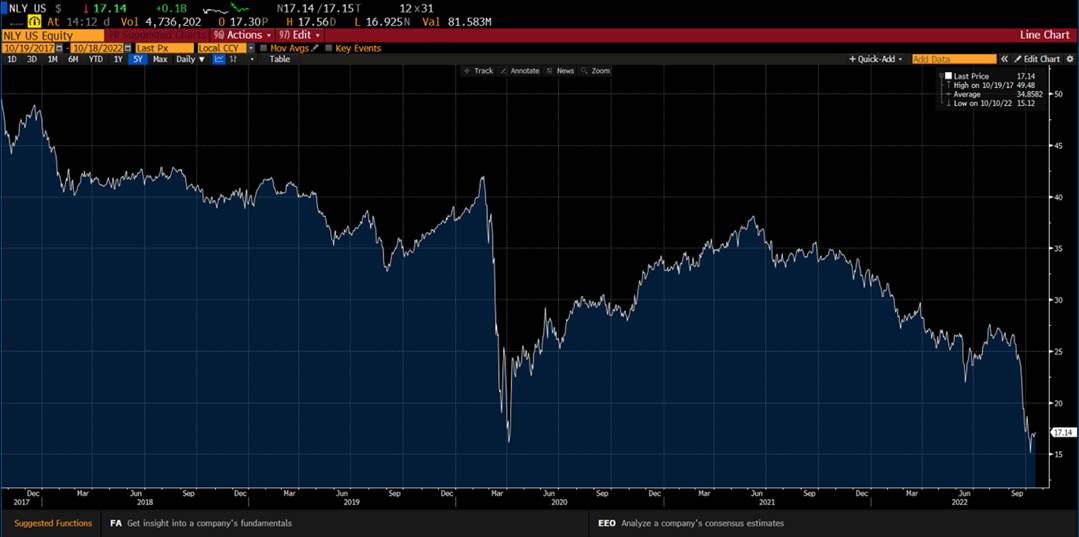 На фоне роста ставок ФРС ипотечные ценные бумаги (как и рынок облигаций) подверглись распродаже, что привело к существенной переоценке балансовой стоимости активов NLY и привело к значительному снижению цены за паи компании, однако это делает последние привлекательными: