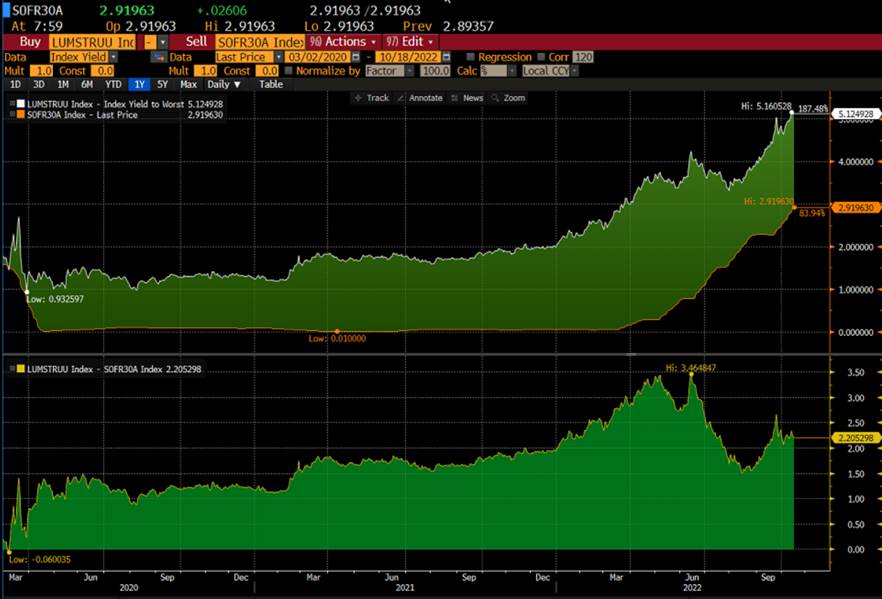 Несмотря на рост ставок, спред (нижняя часть изображения) между стоимостью краткосрочного фондирования и доходностью MBS (верхняя часть изображения) в 2022 году обновляет максимумы