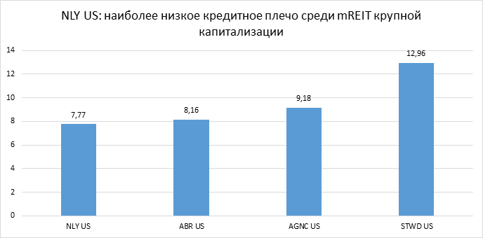 Ипотечные фонды зарабатывают на разнице между стоимостью краткосрочного фондирования и доходностью долгосрочных ипотечных ценных бумаг: данный спред сравнительно невысок и с целью увеличения доходности компания привлекает средства под залог ипотечных ценных бумаг на балансе: на данном фоне показатель кредитного плеча в индустрии запросто может находиться на уровне 10. Для NLY US данный показатель сейчас составляет 7, что ниже других крупнейших по капитализации ипотечных фондов.