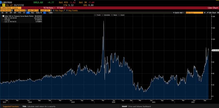 Спред между индексом доходности MBS (преимущественно 30 лет) и казначейскими облигациями аналогичного срока достиг максимальных значений за 5 лет исключая март 2020 года