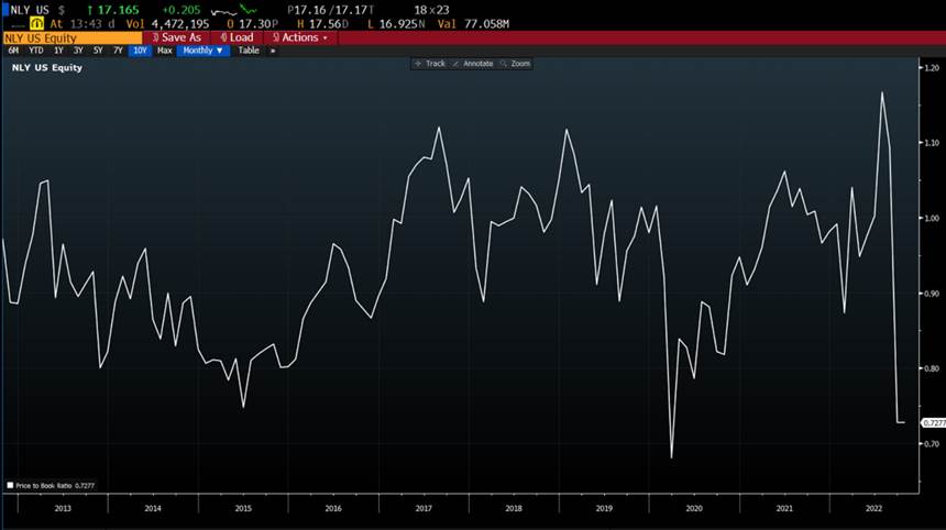 Балансовая стоимость активов NLY существенно снизилась вместе с падением стоимости MBS, однако цена за пай компании снижается еще более быстрыми темпами. На данном фоне компания торгуется по 73% от балансовой стоимости своих активов, что является самым низким показателем за всю историю компании не считая COVID-панику в марте 2020