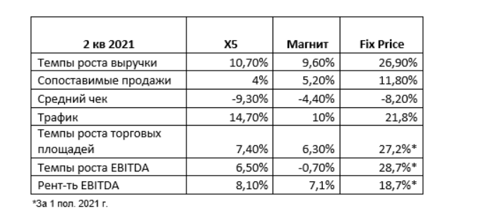 Компания X5 (FIVE RX) представила вчера финансовые результаты за 2 квартал 2021 года, которые в целом соответствовали ожиданиям аналитиков, а в части некоторых показателей даже превзошли консенсус. Акции компании практически не отреагировали на публикацию результатов. Рост выручки X5 за квартал составил 10,7% г/г, 9,6 п.п. из которых обеспечил рост офлайн-продаж и 1,1 п.п. – рост продаж цифровых бизнесов, которые составили 2% консолидированной выручки. Выручка во 2 квартале составила 546,5 млрд руб., выручка за 6 месяцев — 1 трлн руб. Рост сопоставимых продаж за 2 квартал 2021 года составил 4%, рост торговой площади - на 7,4%, средний чек снизился на 9,3% (тенденция всех ритейлеров), а трафик вырос на 14,7%.